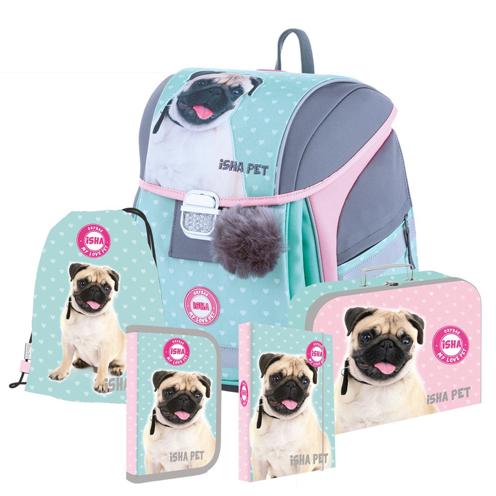 Školní set pro prvňáčka s motivem pejska. Set obsahuje školní batoh Premium Light, sáček na cvičky, naplněný jednopatrový penál, kufřík a box na sešity A4.