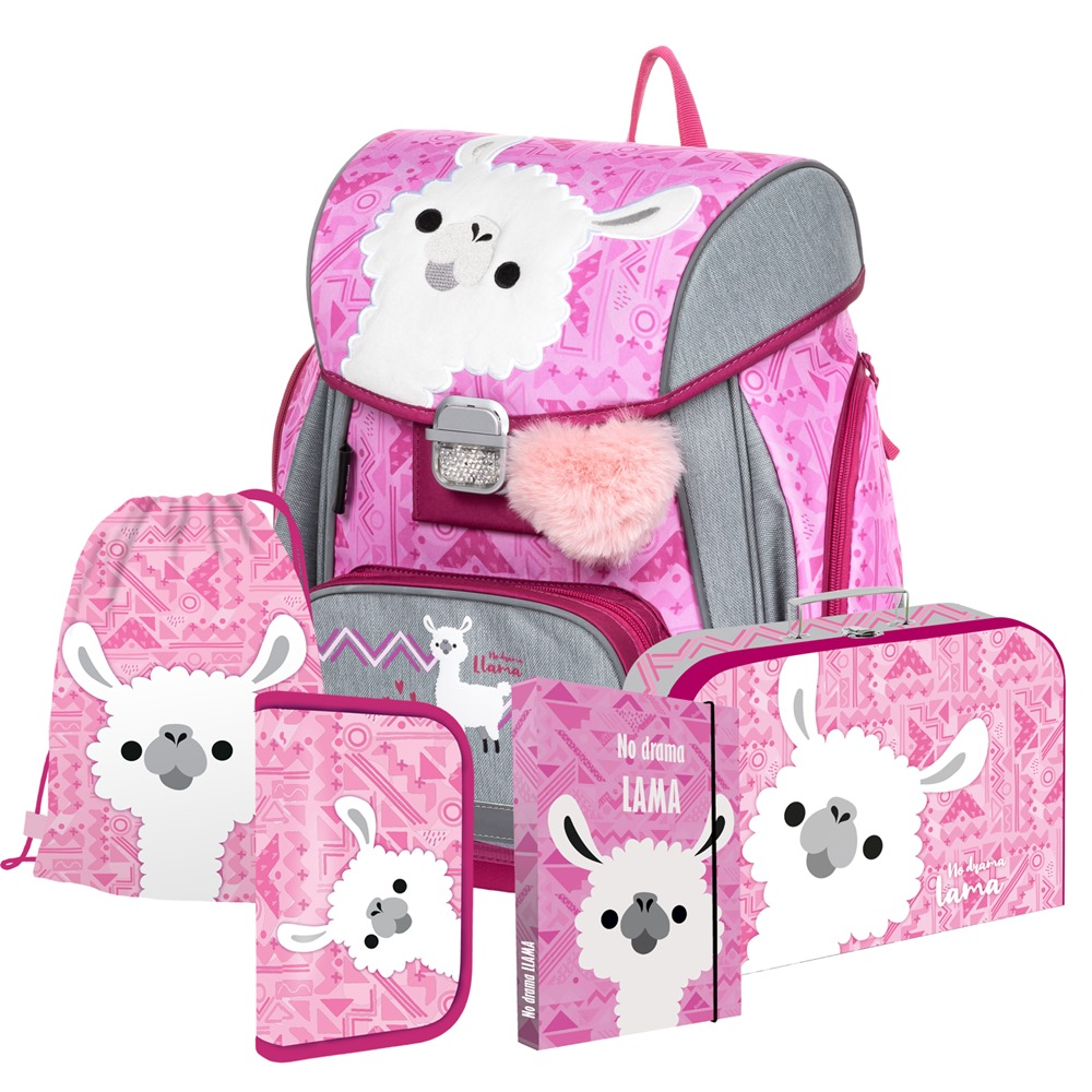 Školní set pro prvňáčka s motivem lamy. Set obsahuje školní batoh Premium, sáček na cvičky, naplněný jednopatrový penál, kufřík a box na sešity A4.