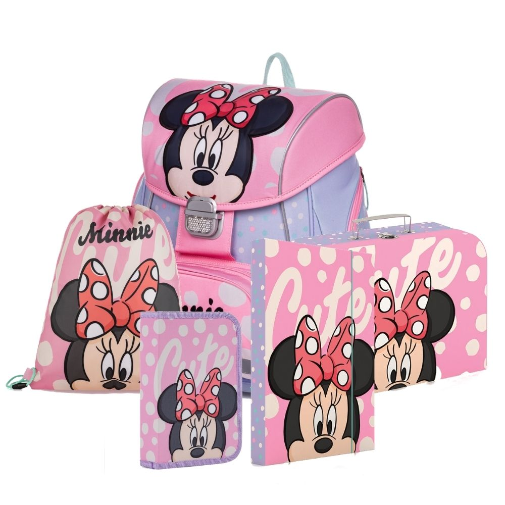 Školní set pro prvňáčka s motivem Minnie. Set obsahuje školní batoh Premium, sáček na cvičky, prázdný jednopatrový penál, kufřík a box na sešity A4.