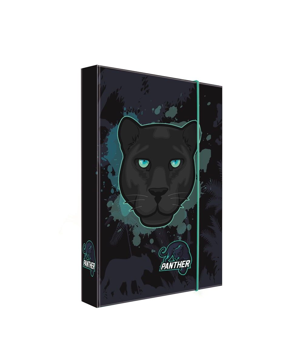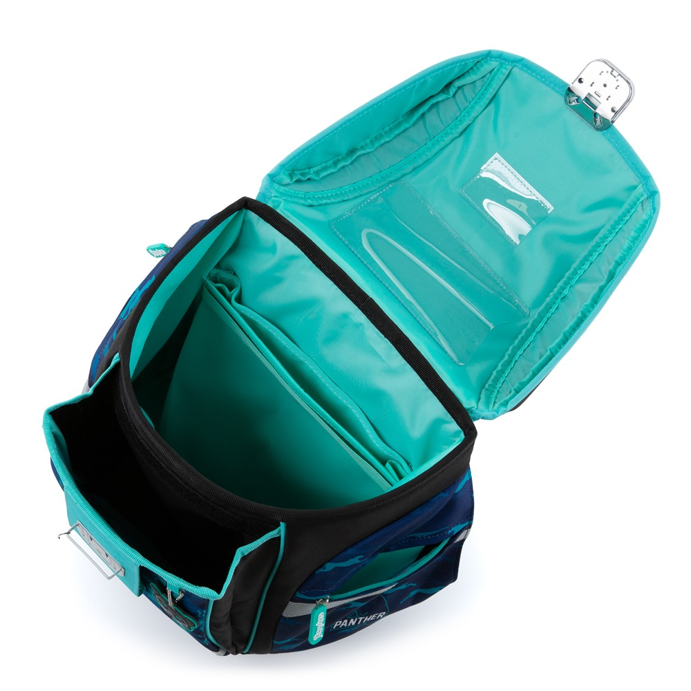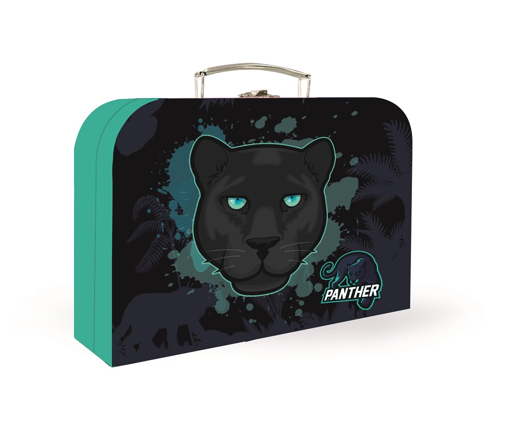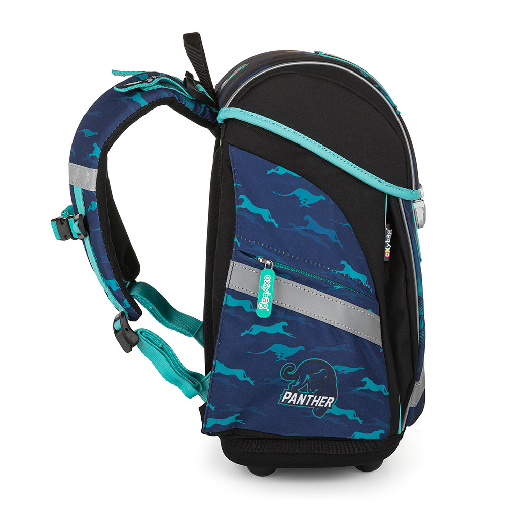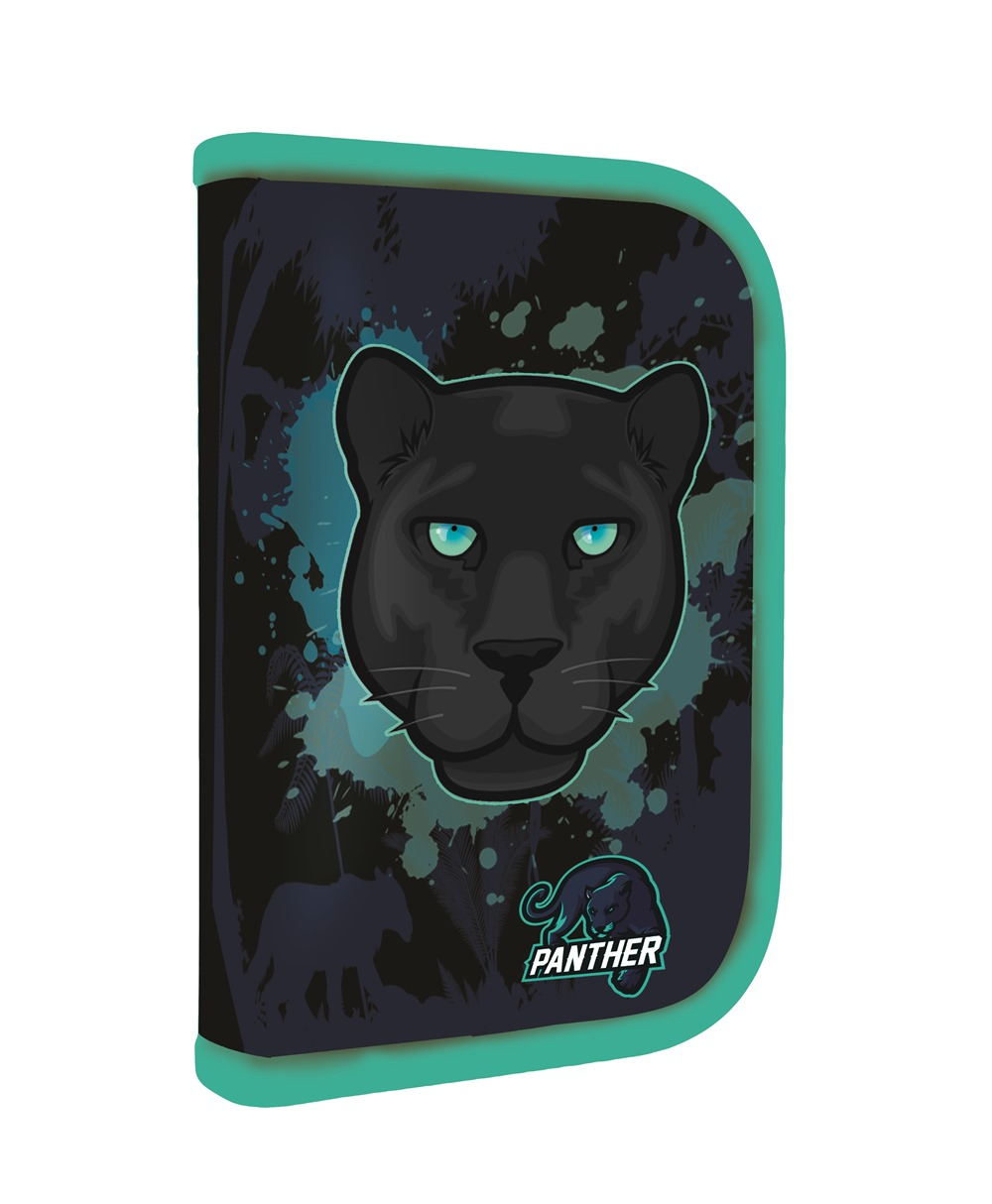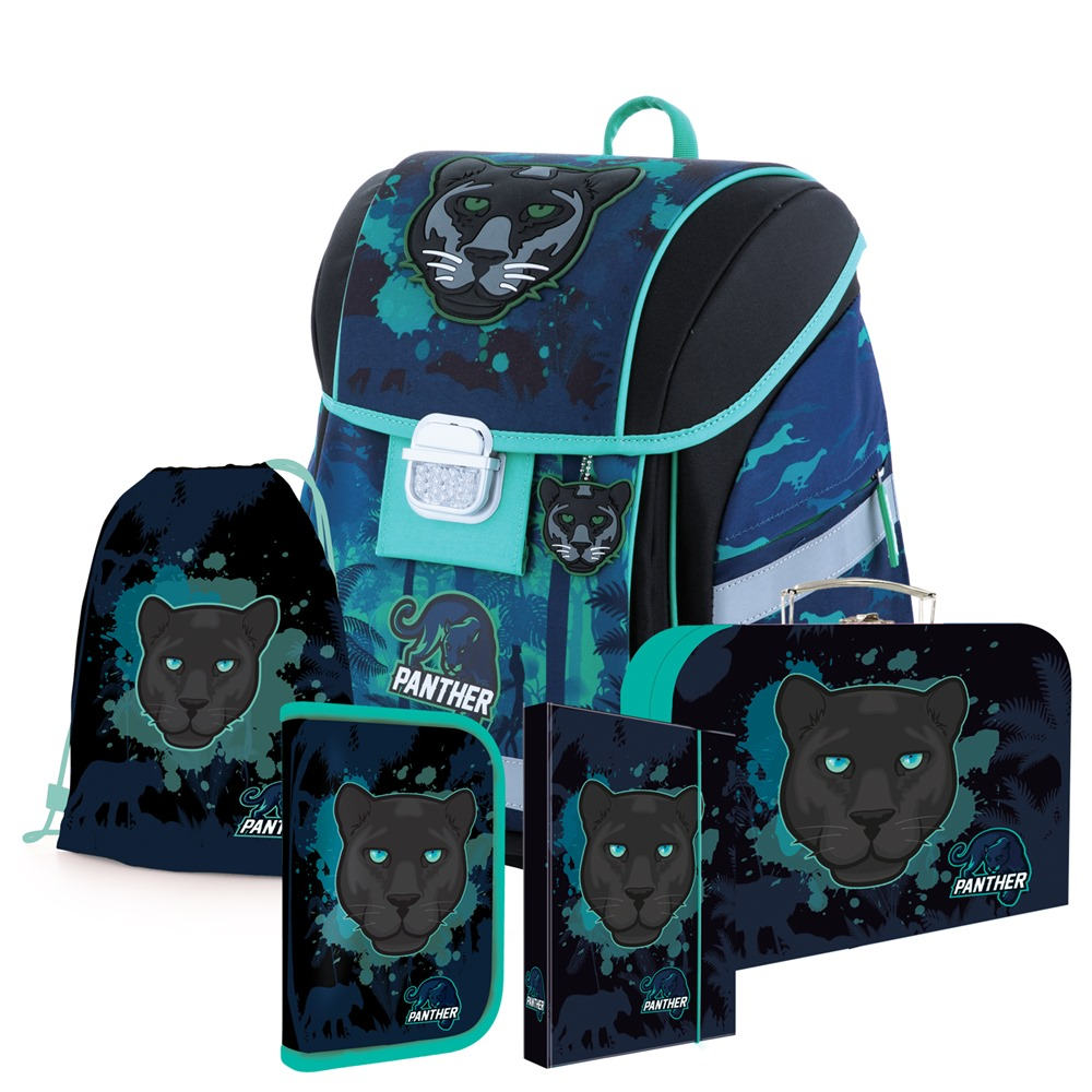 Školní set pro prvňáčka s motivem pantera. Set obsahuje školní batoh Premium Light, sáček na cvičky, naplněný jednopatrový penál, kufřík a box na sešity A4.