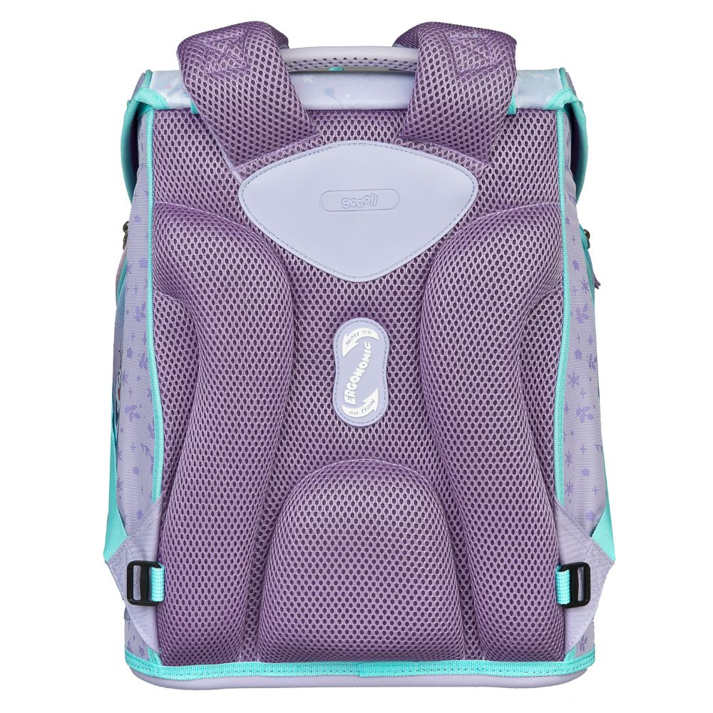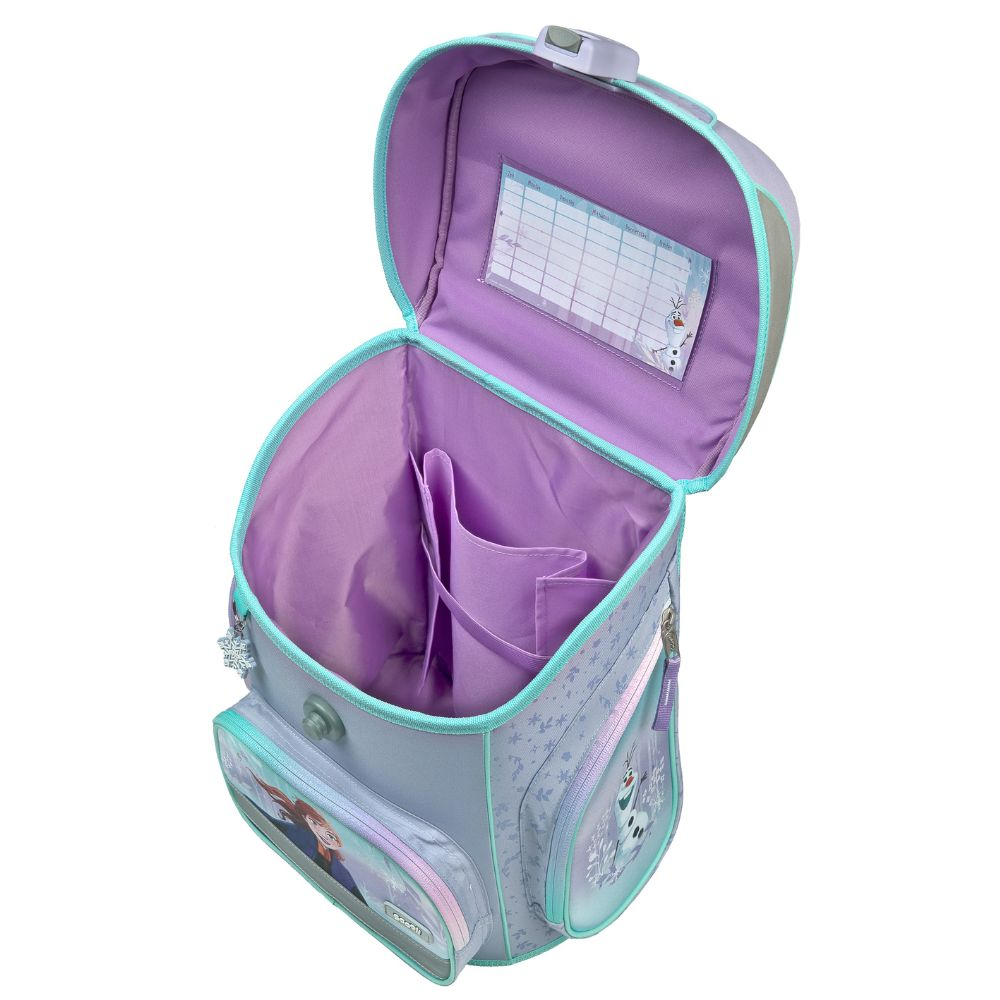 5dílný školní set s motivem Ledového království obsahuje vše, co malý školák potřebuje: prostorný školní batoh (cca 18 l) s ergonomickým polstrováním, odnímatelným hrudním popruhem, reflexními prvky a magnetickým zapínáním, dále penál naplněný kvalitními tužkami značky Eberhard Faber, pouzdro, sáček na přezůvky a stylový přívěsek.