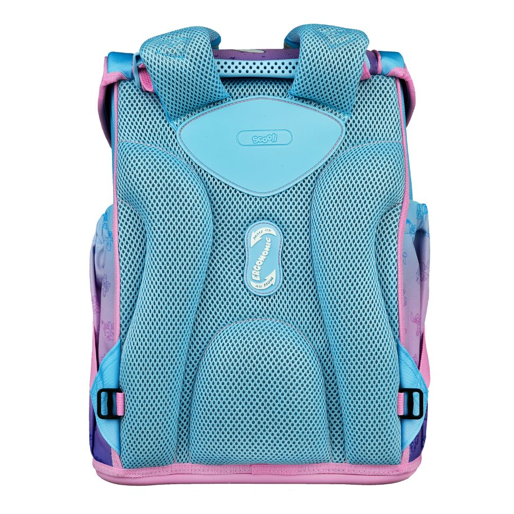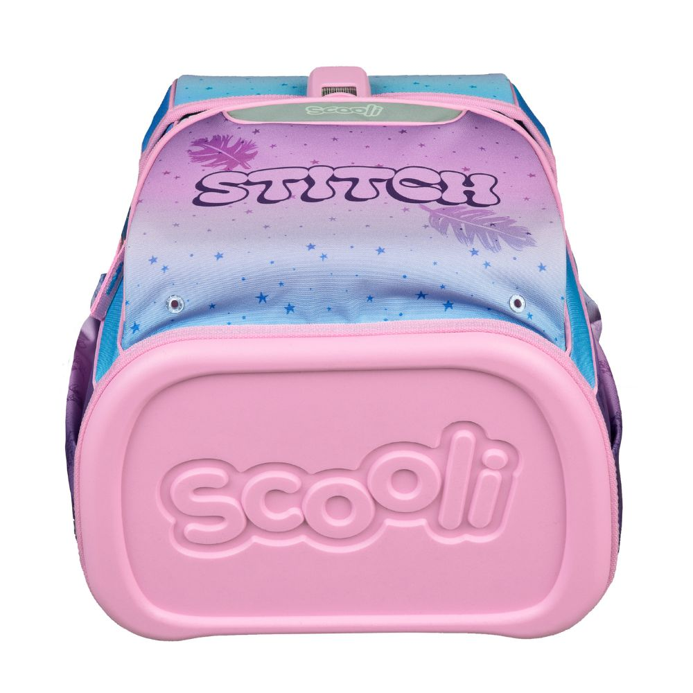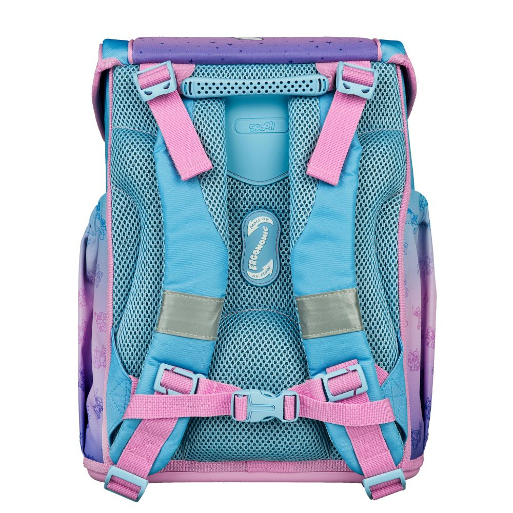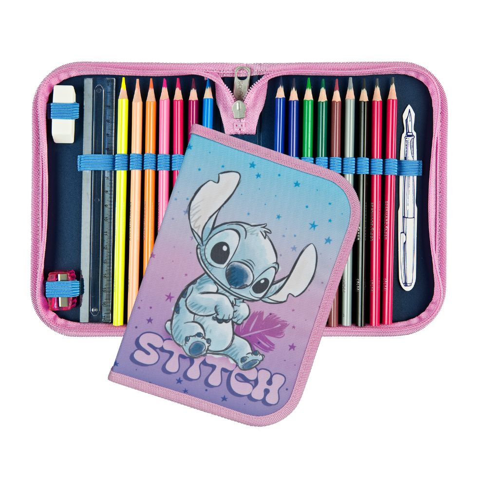 5dílný školní set s motivem Stitch obsahuje vše, co malý školák potřebuje: prostorný školní batoh (cca 18 l) s ergonomickým polstrováním, odnímatelným hrudním popruhem, reflexními prvky a magnetickým zapínáním, dále penál naplněný kvalitními tužkami značky Eberhard Faber, pouzdro, sáček na přezůvky a stylový přívěsek.