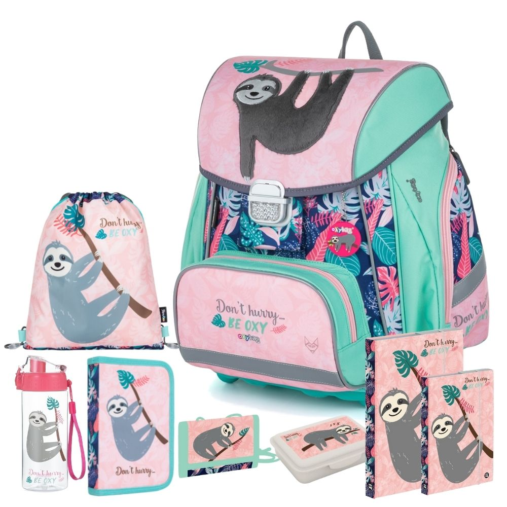 Školní set pro prvňáčka s motivem Lenochoda. Velký set obsahuje školní batoh Premium, prázdný penál, sáček, peněženku, box na svačinu, láhev na pití a desky na sešity A4, A5.