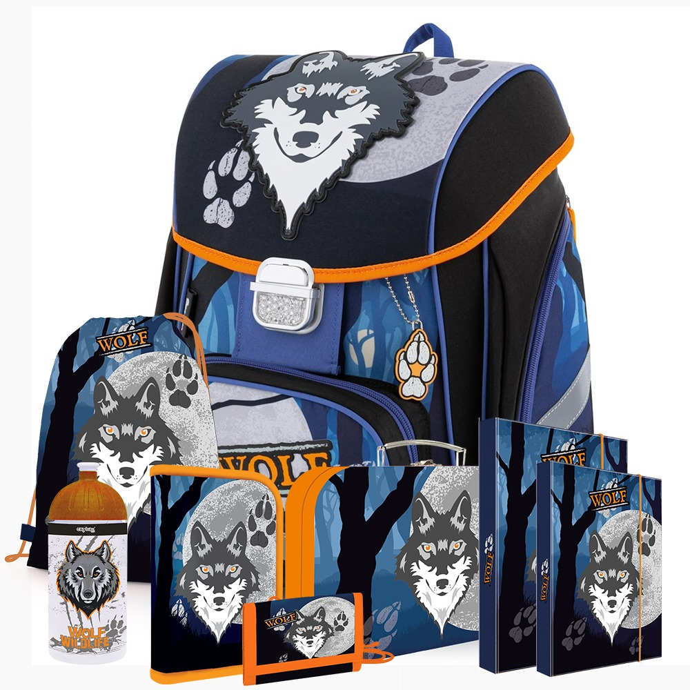 Školní set pro prvňáčka s motivem vlka. Velký set obsahuje školní batoh Premium, naplněný penál, sáček, peněženku, kufřík, láhev na pití a desky na sešity A4, A5.