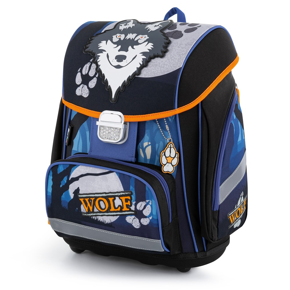 Aktovka: Školní aktovka z řady Premium s motivem vlka je anatomicky tvarovaná a zajišťuje tak správné usazení na zádech. Vyztužená záda a vnitřní výztuha udržují stálý tvar batohu. Polstrování je z příjemného prodyšného materiálu, široké měkčené popruhy jsou navrženy tak, aby dokonale přilnuly a rovnoměrně zatížily ramena dítěte. Aktovka se skládá z jedné prostorné komory, kam se pohodlně vejdou všechny školní pomůcky pro děti v 1. a ve 2. třídě. Dno batohu je z pevného materiálu, chrání tím obsah před převržením a vysypáním. Zapínání je na bezpečnostní přezku. Přední kapsička je určena na svačinu, nechybí řada reflexních prvků, díky kterým je aktovka viditelnější.