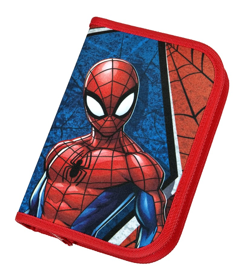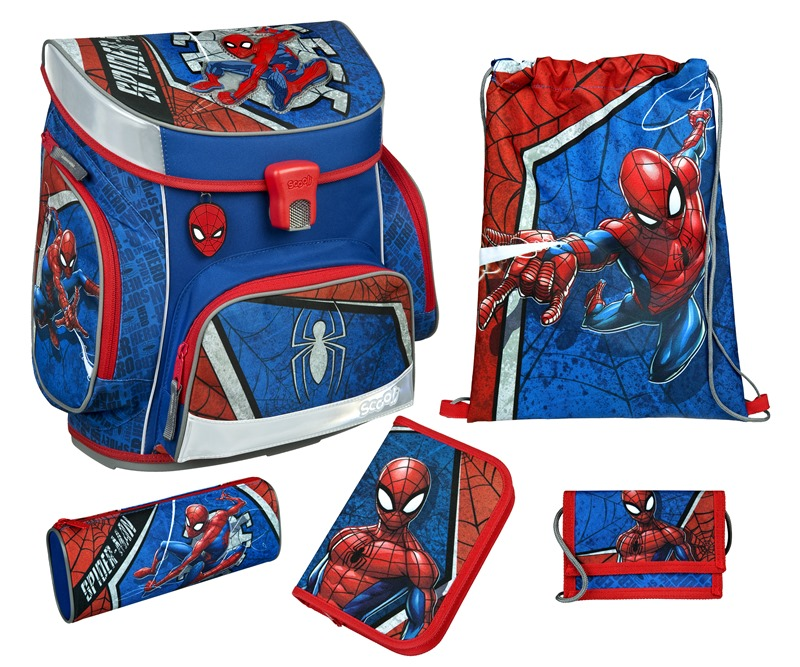 Školní set pro prvňáčka Scooli s motivem Spidermana. Set obsahuje školní batoh, sáček na cvičky, naplněný jednopatrový penál, etui a peněženku.