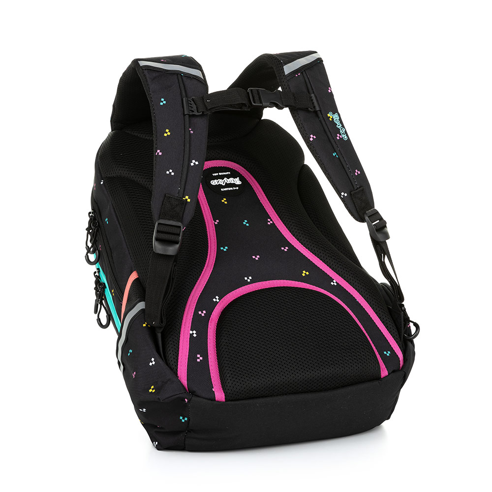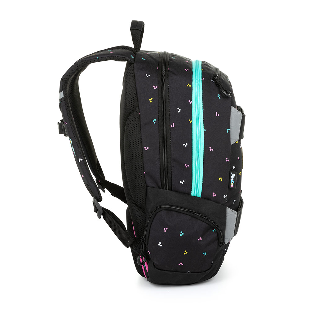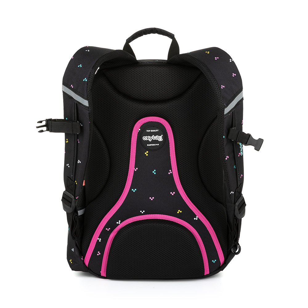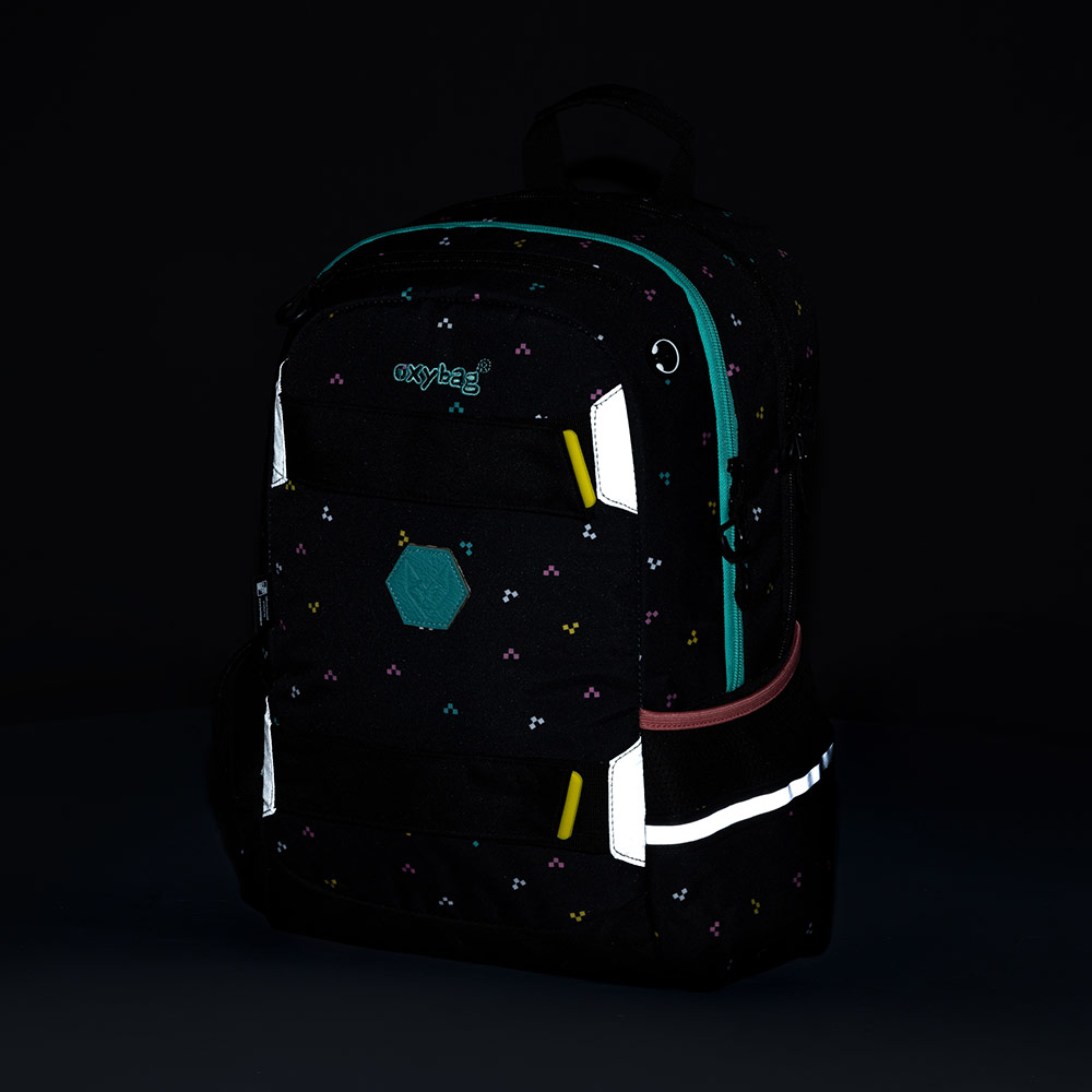 Studentský i volnočasový školní batoh řady OXY SPORT vyniká ergonomicky tvarovanými zády, nastavitelnými polstrovanými ramenními popruhy a hrudním popruhem, díky kterým se pohodlně nosí. Batoh se skládá ze dvou hlavních komor a jedné menší přední kapsičky opatřenými pevnými zipy a praktickými poutky. Uvnitř batohu je vyztužená kapsa na notebook', karabina na klíče a menší kapsa na drobnosti. Nechybí také boční kapsa na lahev na pití a řada reflexních prvků, díky kterým je batoh lépe viditelný. Batoh je ideální jak do školy pro školáky na druhém stupni tak i pro volnočasové aktivity studentů a dospělých. Rozměry: 46 x 32 x 15 cm. Objem: 23 l. Nosnost: 8 kg. Nízká hmotnost: ? 830 g.