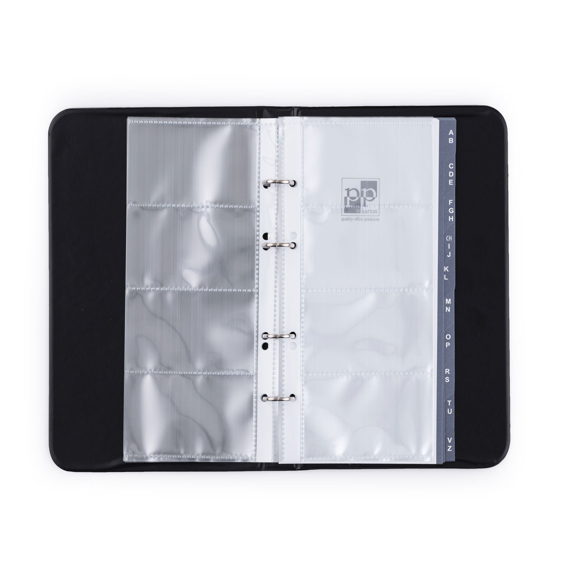 Oblíbený vizitkář s kroužkovou mechanikou a vnitřními listy až na 80 ks vizitek. Doplněn registrem A-Z.