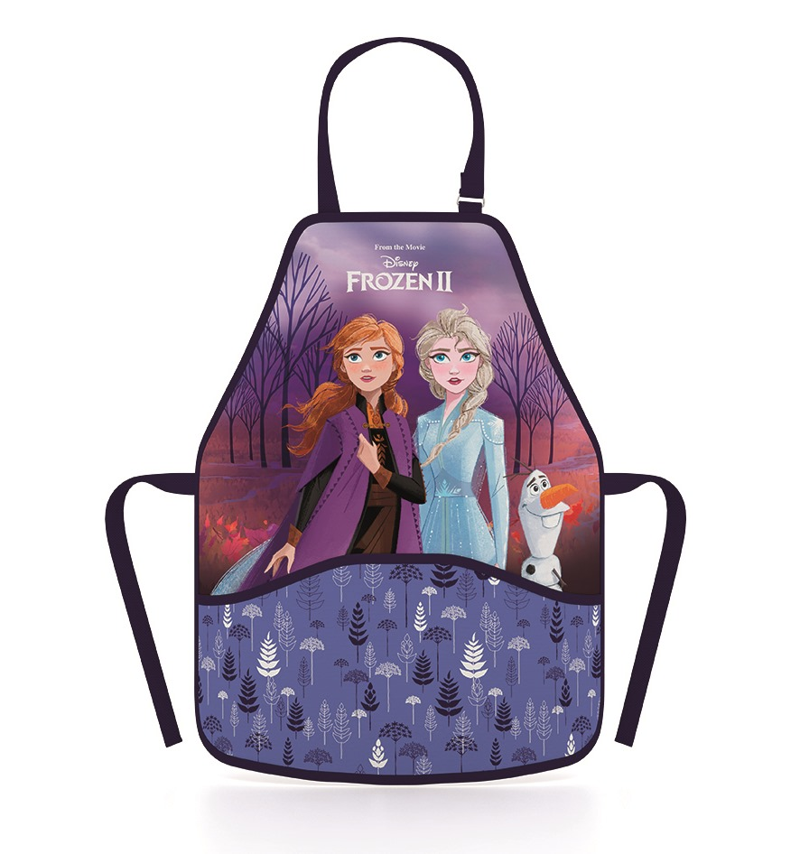 Zástěra s motivem Frozen do výtvarné výchovy či na jiné tvořící aktivity. Zapínání na sponku kolem krku (délka max. 50 cm), v pase šňůrky na zavázání (max. 80 cm). Vepředu dvě prostorné kapsy.